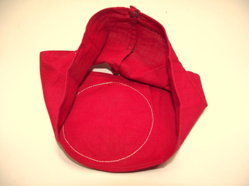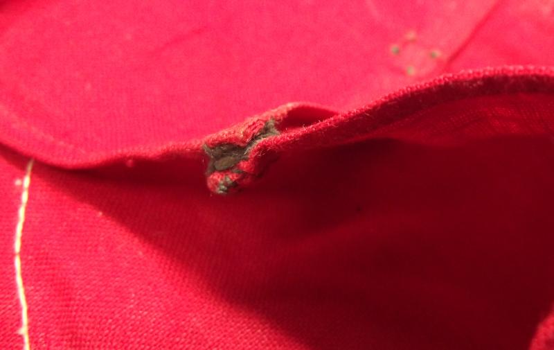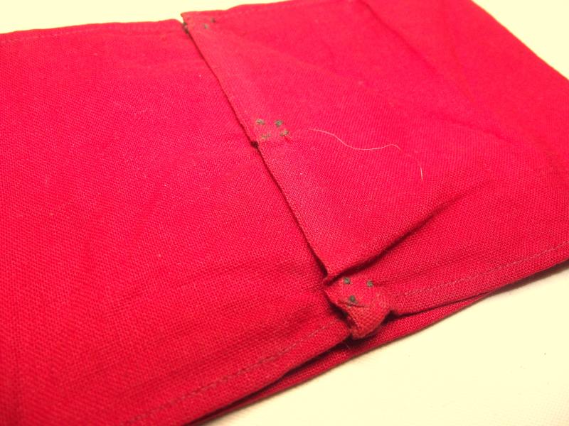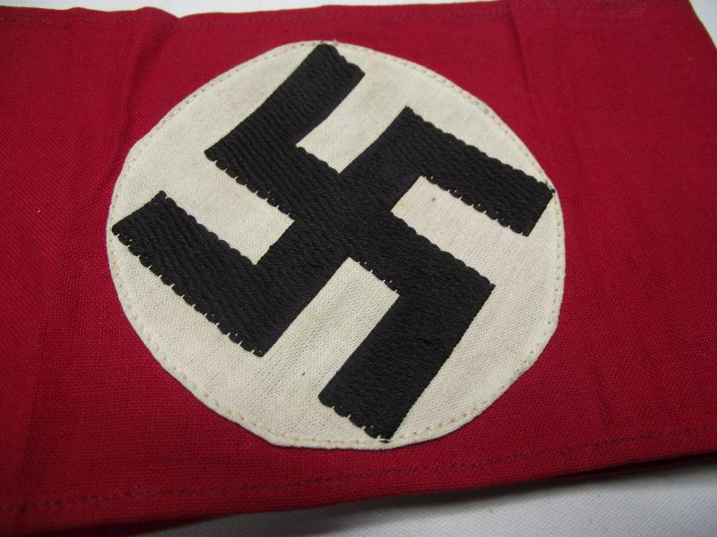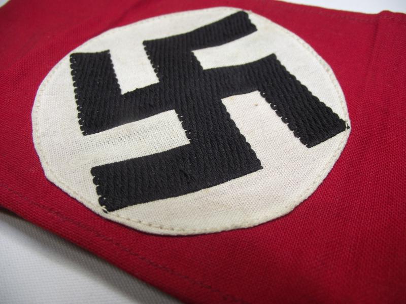 In nice used condition with a Bevo type swastika on white roundel stitched to a filed of red cotton material with its edge folded and machine stitched into place. This example has snap buttons to the back for fitting to the uniform. I have and will not try and open the snap buttons as they all appear to have not been open for a number of years.
